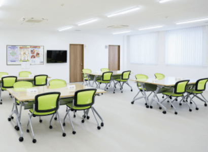 事務棟には研修に関する設備の他に、交流エリアやシャワー室などを完備。日々の研修で疲れた頭と身体をリフレッシュし、また研修生がコミュニケーションを取りやすい設備が充実しています。